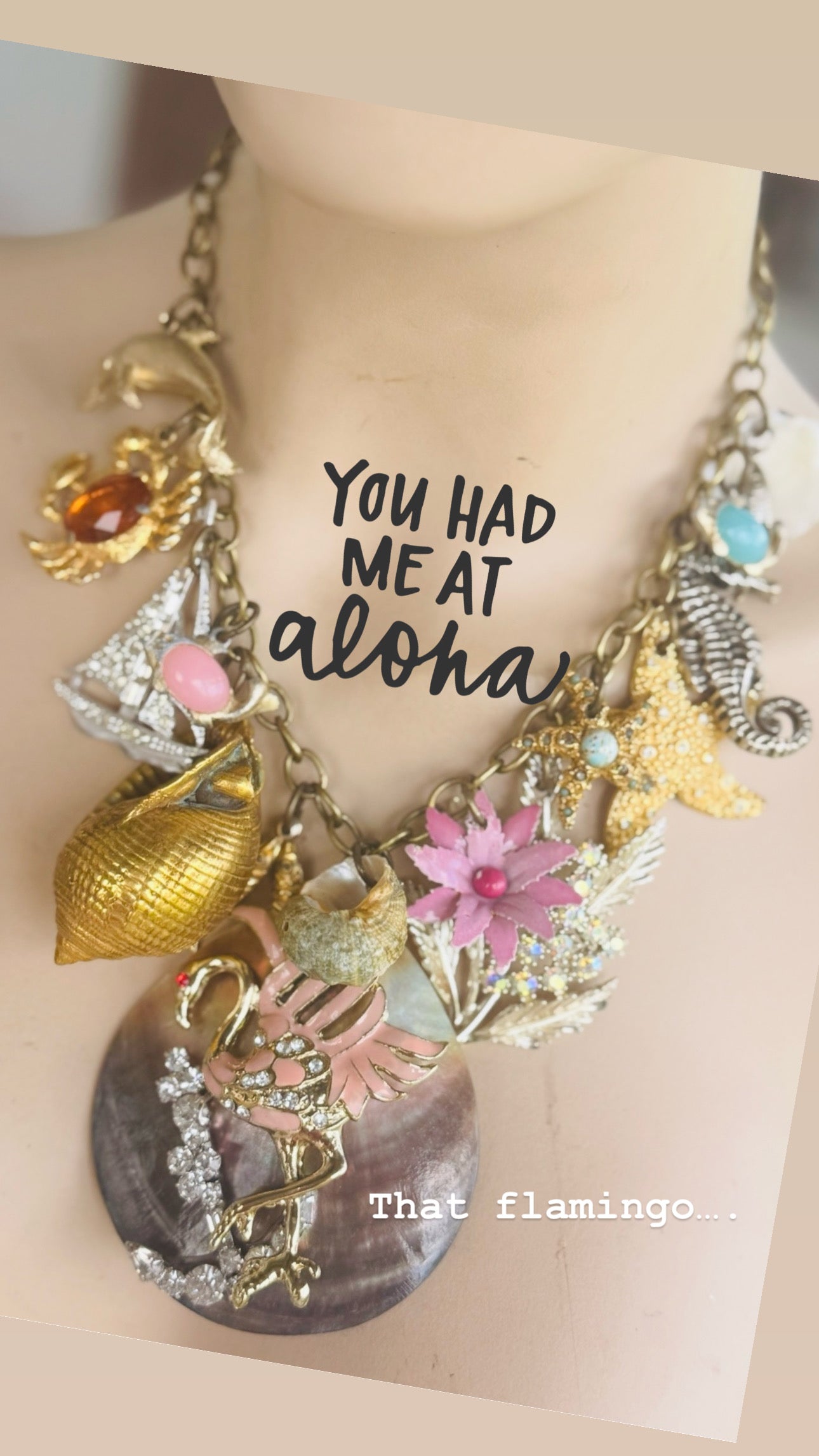Vintage 1950s pink enamel flamingo, shells and baubles